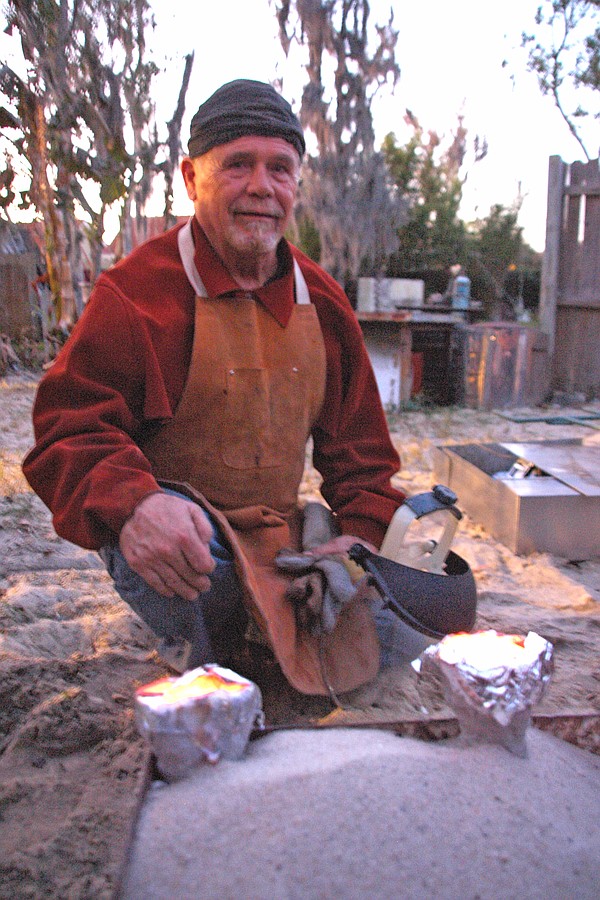 Photo by: Isaac Babcock - Artist David Cumbie poses with some of his works in progress after pouring molten bronze at the Crealde School of Art's Night of Fire.
