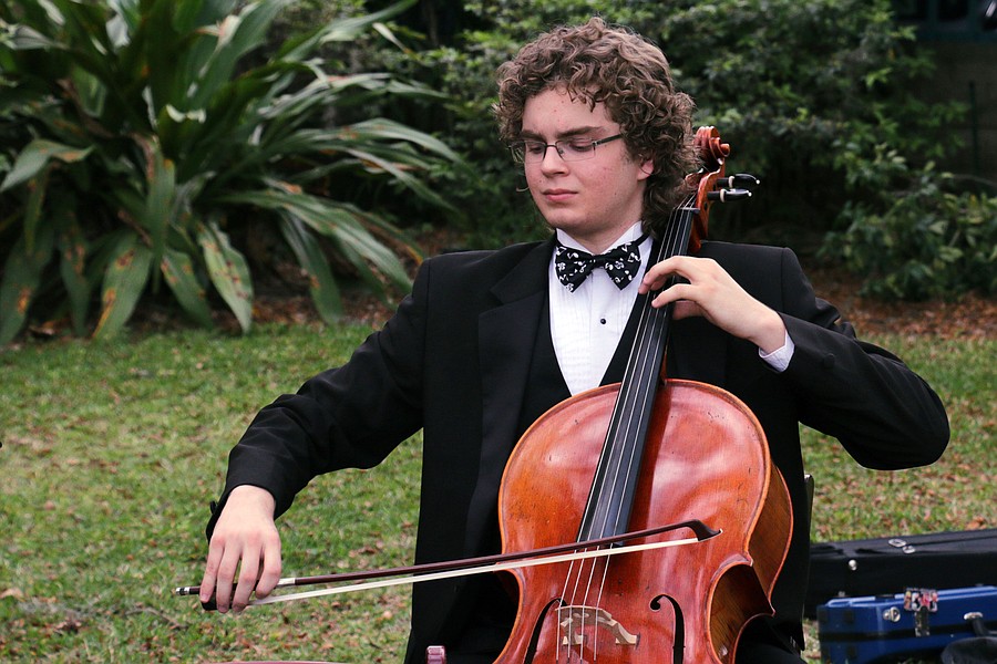 Photo by: Shana Medel - Cellist Jean-Marie Glazer of the Florida Symphony Youth Orchestra performs as guests arrive at the Maitland Art & History Museums for the Mustard Seed's Chairs 4 Charity event on Friday, April 1.