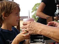 Will Holden, 5, runs on a hamster wheel to make a snow cone at the Winter Park Library Summer Reading Kickoff.