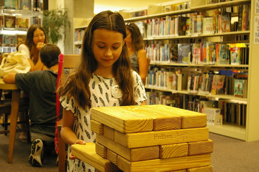 Sienna Vittone, 12, plays Jenga at the Winter Park Library Summer Reading Kickoff Saturday. Vittone attends Glenridge Middle School and loves science fiction books.