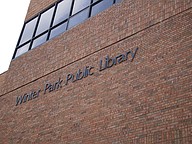 The word "imagine" is engraved in a bench outside the Winter Park Library as readers of all ages enter the building.