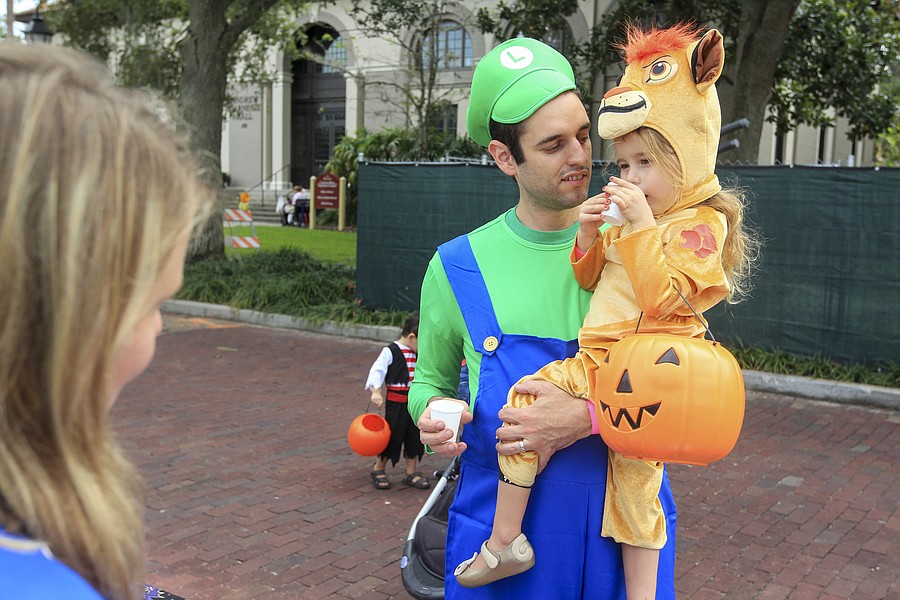 Rebecca Sands, 3, enjoys a small cup of lemonade as her dad, Mike, holds her during the Halloween Howl at Rollins College.
