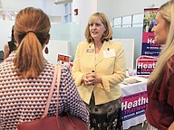 School Board (District 6) candidate Karen Castor Dentel talks with visitors at her booth during the Winter Park Chamber of Commerce's Political Mingle and Straw Poll.
