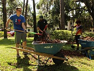 Zach Smirti shoveled mulch into the wheelbarrow.