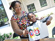 Felicia Chukwuneke and Chibuikem Onyeji, 6, created artwork by pressing paper onto carved templates covered in paint.