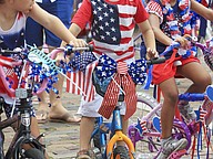 Children dressed in their red, white and blue take it easy as they wait for the bicycle parade in downtown.