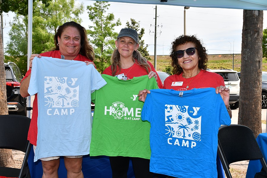 YMCA of Central Florida's Kim Scarlata, Deanna Lopez and Cony Carmona handed out T-shirts from past summer camps to children who registered at Healthy Kids Day.