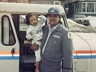 Ramanand Rewah, holding his young daughter, started his 35-year career with the United States Postal Service in Queens, New York.