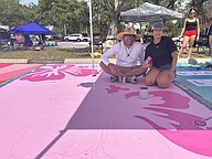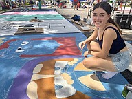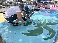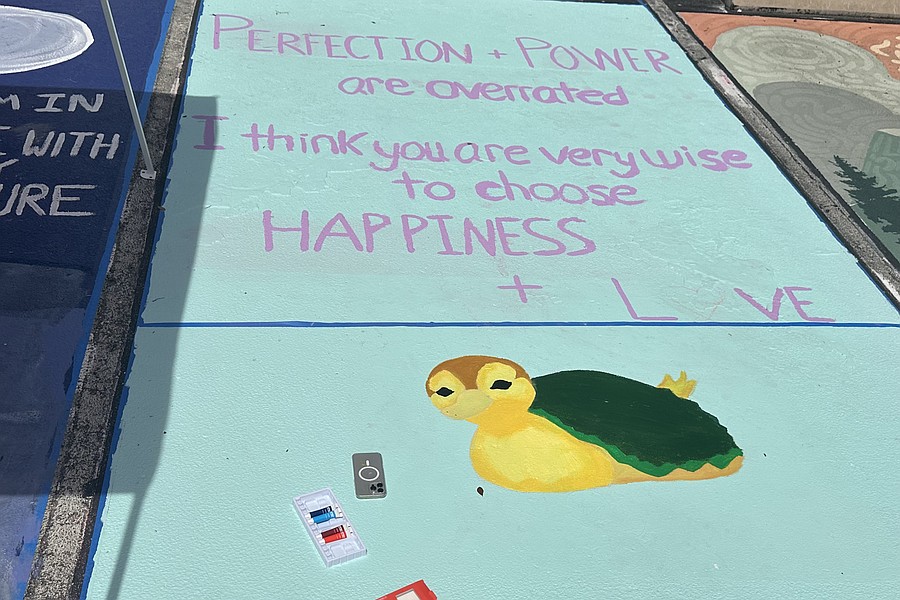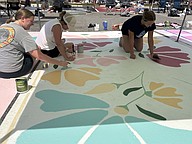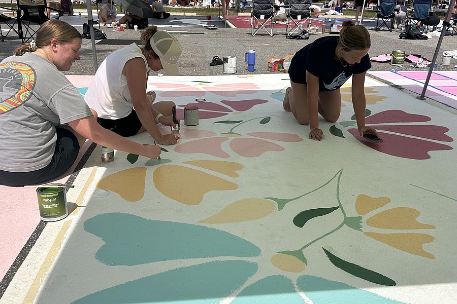 Senior Kena Terry, right, along with her mom, Kodi Terry, and neighbor, Brooke Gooderham, diligently worked on her parking spot, painting some flowers.