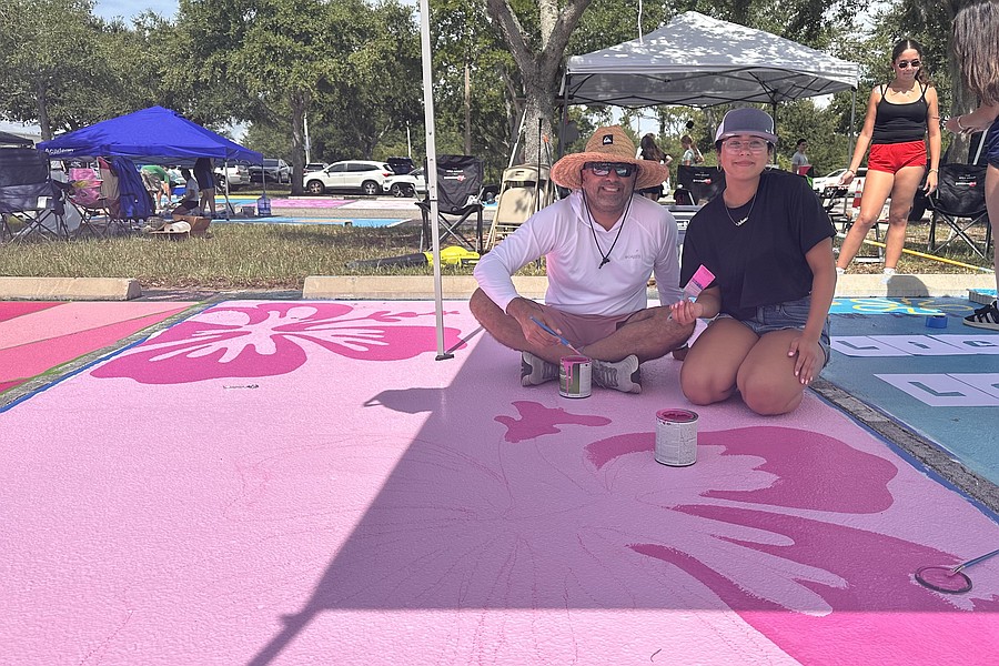 Victoria Velasquez, senior, and her dad, Amilcar Velasquez sat in the shade while coloring in a pink flower.