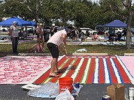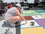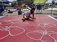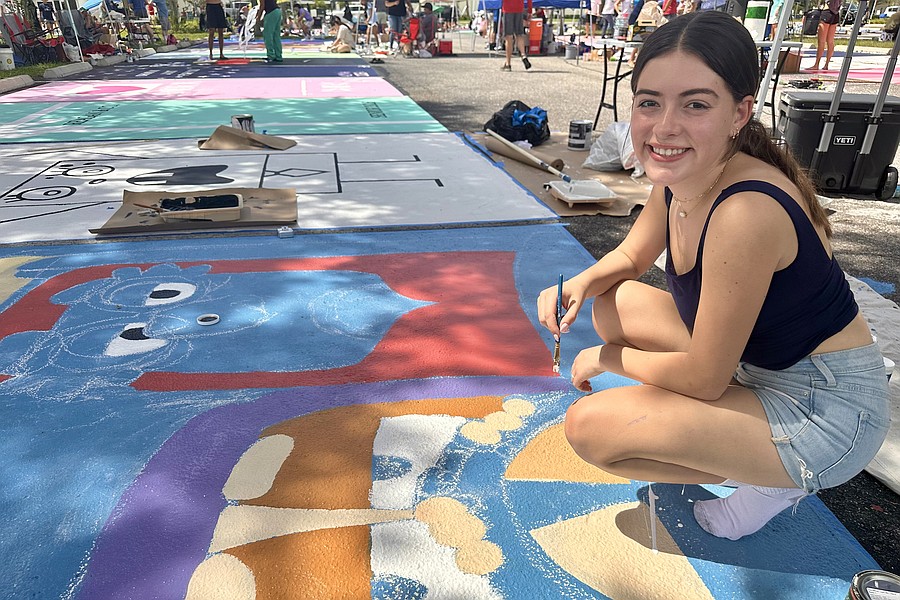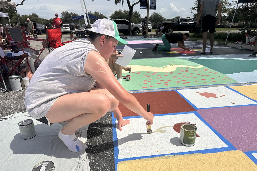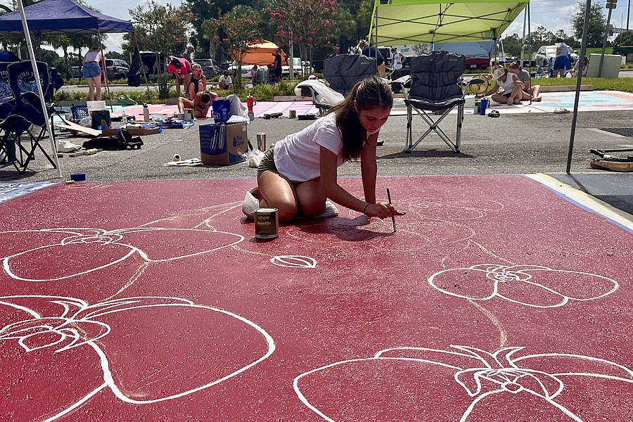 Lillian Nadrowski worked on her spot by painting multiple white flowers on a red background.