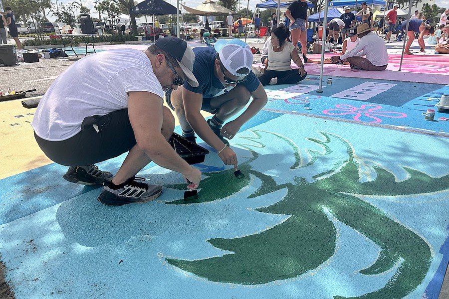 Cameron Kotch, right, and his dad, Gabriel Kotch, worked together to paint a palm tree.