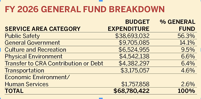 The General Fund expenditures for Fiscal Year 2026 totals $68,780,422, with 56.3%, or $38,693,032, of the funds going toward public safety. The personnel and operating costs for the fire department total $14.6 million, while the police department’s cost totals $22.2 million.