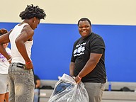 The First Academy football players Devin Jackson, left, and Trintin Thomas carried a load of backpacks at the free youth event.