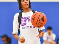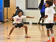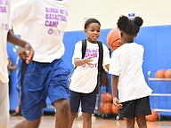 Amari Miller threw up a pair of peace signs during the Global Not Local basketball camp.