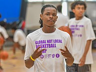 Jaja Richards took a minute from playing basketball to watch his friends shoot around at the Global Not Local camp.