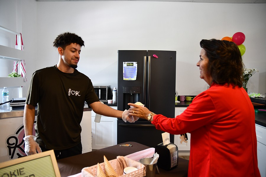 Jorge Morales with Kelly's Ice Cream handed a scoop of ice cream to Pat Brown, a member of the West Orange Chamber of Commerce.
