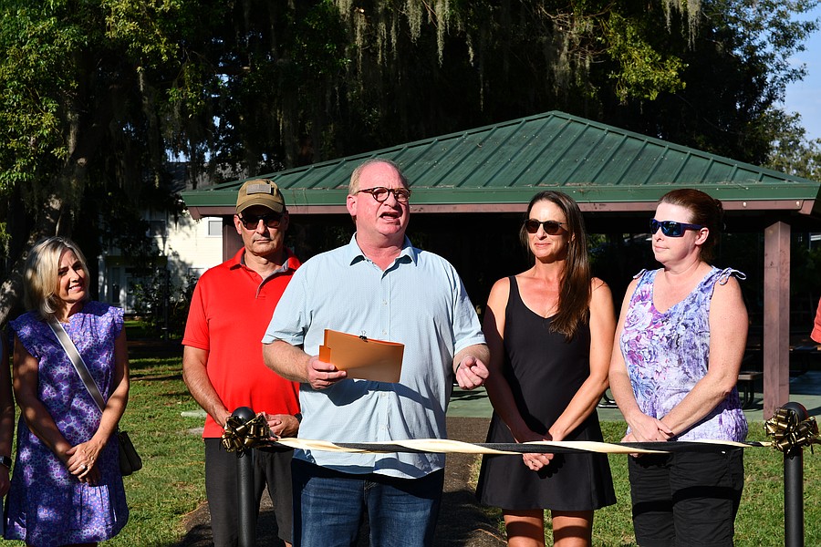 Mayor Jim O'Brien, center, shared remarks at the ribbon cutting for the Centennial Walkway at Central Park.