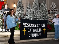 Members of Resurrection Catholic Church stand tall as the pastor reads a passage from the Bible.