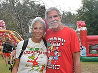 Lana and Mike Gehrsitz dressed in Christmas attire for Oakland’s Santa’s Lane.