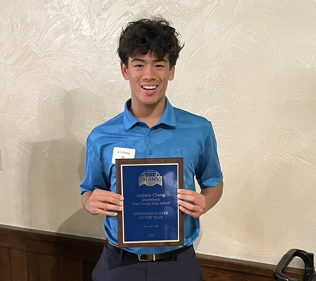 West Orange football team’s quarterback AJ Chung was awarded the Offensive Player of the Year Monday, Dec. 8 at the Orlando Touchdown Club’s ceremony.