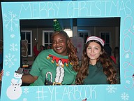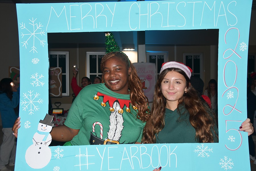 Jazmyne Greene and Henley Brown from the yearbook staff walked around with a frame so attendees could take photos with it.
