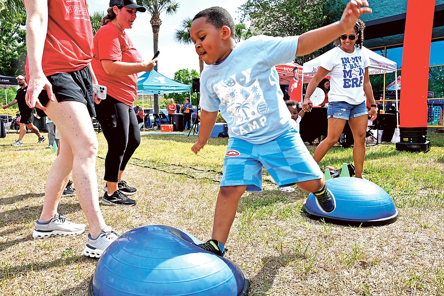Don Denmark, 5, jumped from one BOSU ball to the next in the obstacle course at the Roper YMCA’s Healthy Kids Day celebration.