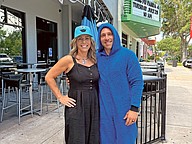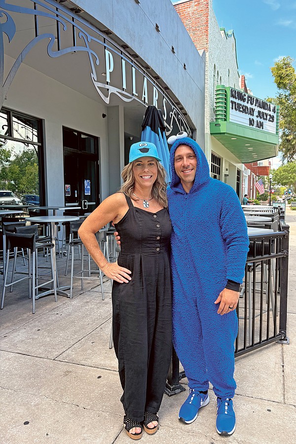Realtor Matt Sutton dresses as Cookie Monster and passes out cookies to businesses in Winter Garden with the help of lender Barb Stewart.