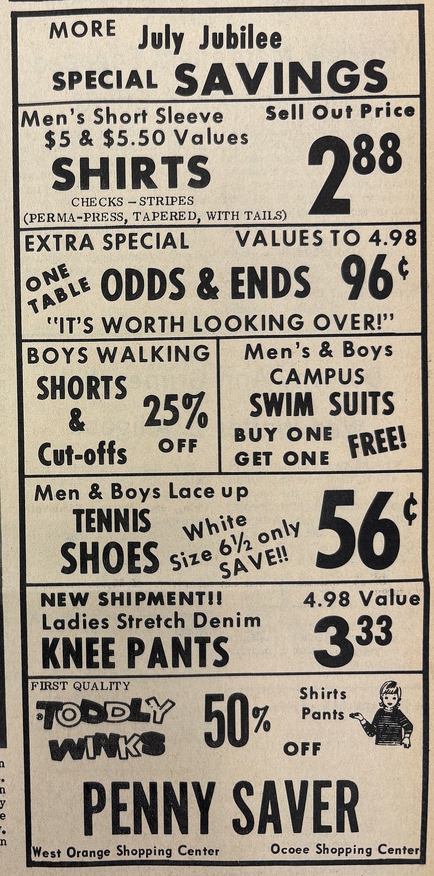 Locals who wanted to shop for clothes in the 1970s had several options in West Orange County, including Penny Saver stores in the West Orange and Ocoee shopping centers. Where else could you get men’s and boys’ tennis shoes for 56 cents, ladies’ stretch denim knee pants for $3.33 or Toddly Winks children’s shirts and pants for 50% off regular price?