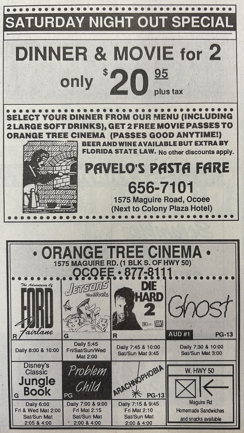 Two Ocoee businesses collaborated on a dinner-and-movie deal that benefited Italian food and film lovers. Pavelo’s Pasta Fare and Orange Tree Cinema, both on Maguire Road near the former Colony Plaza Hotel, teamed up to offer dinner and a movie for two for $20.95. The advertisement ran in The West Orange Times.