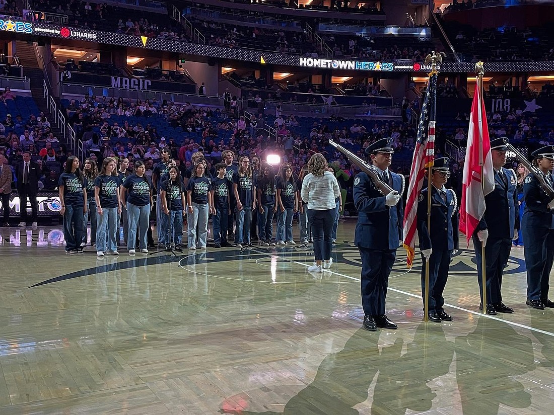 The choir sang center court at the Orlando Magic game March 4.