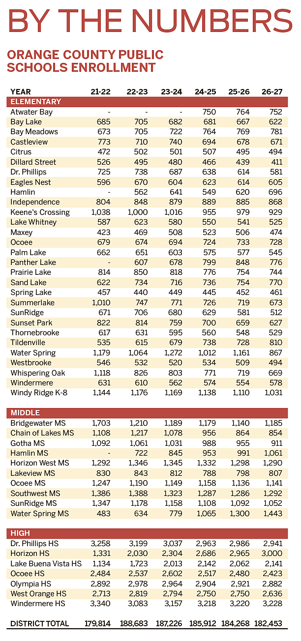 While some areas, including Horizon West, are booming, others are experiencing aging populations that no longer have school-age children. As a result, Scott Howat, chief communications officer for the district, said the district is seeing a decline in kindergarten registrations in some areas of the county.