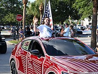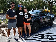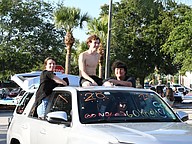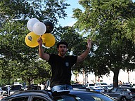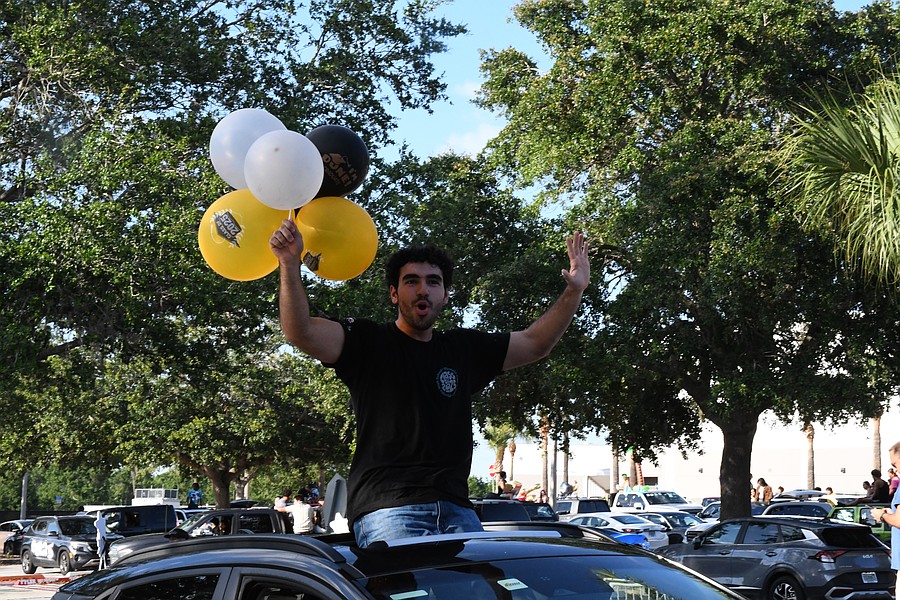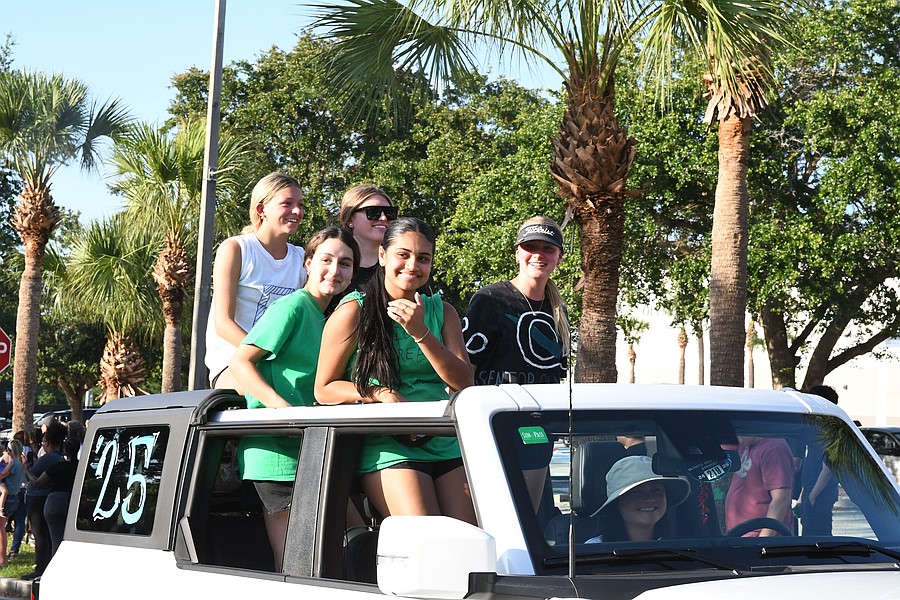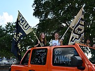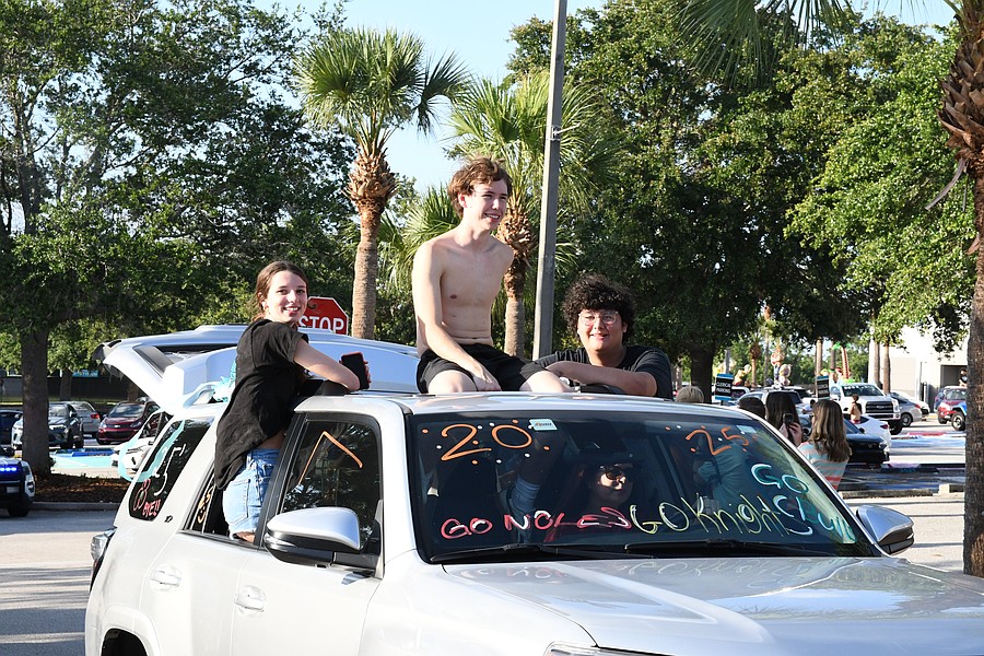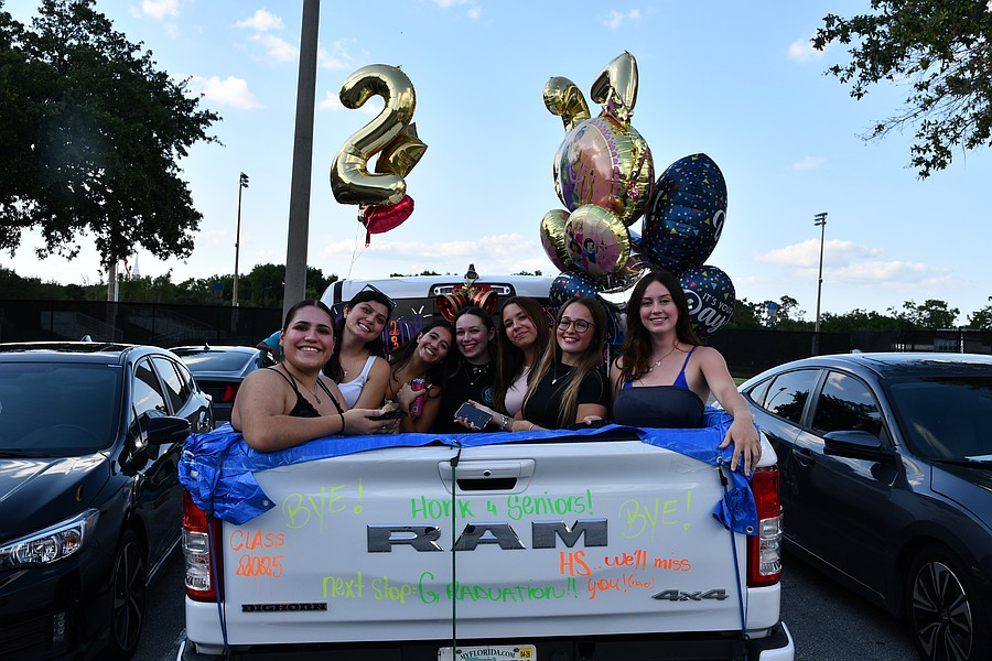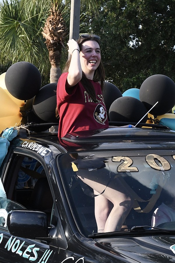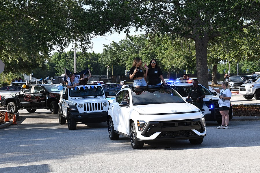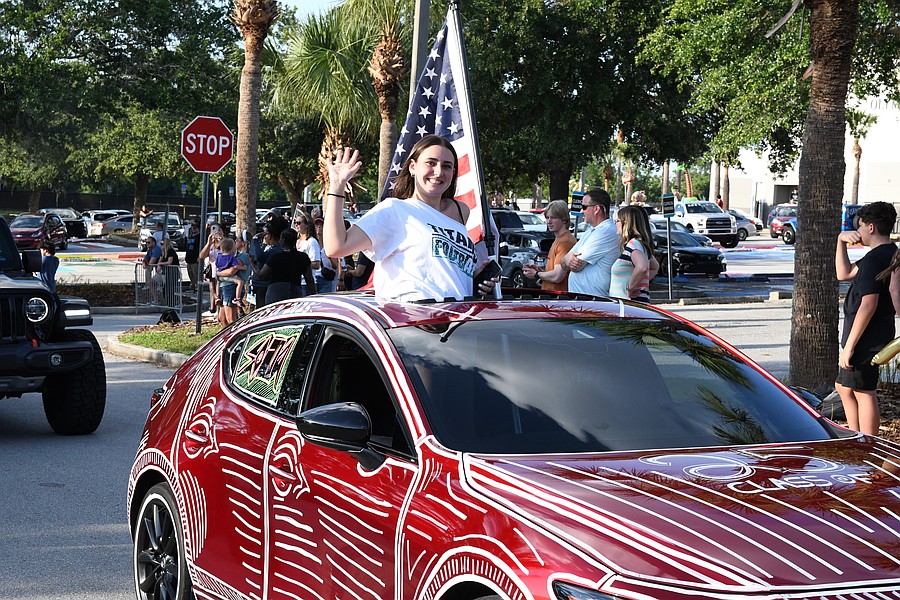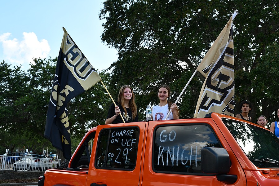 Olympia High School seniors Abby Landman and Alexis Sheldon stood in the back of an orange Jeep and waved their giant University of Central Florida flags with pride.