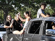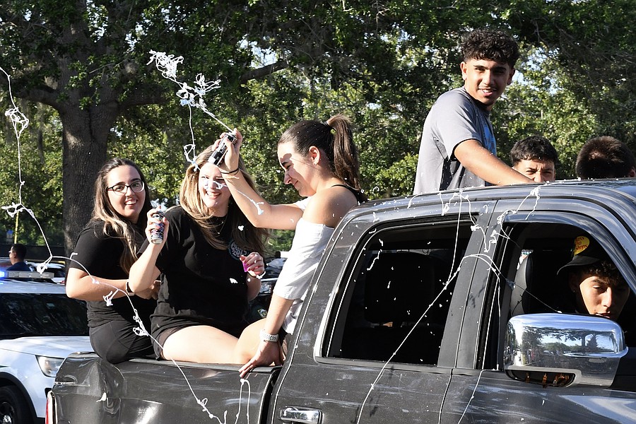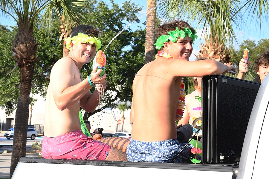 Some Olympia High seniors turned the parade into a pool party by putting water in the bed of the truck.