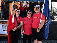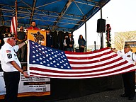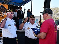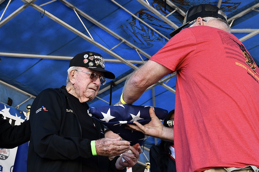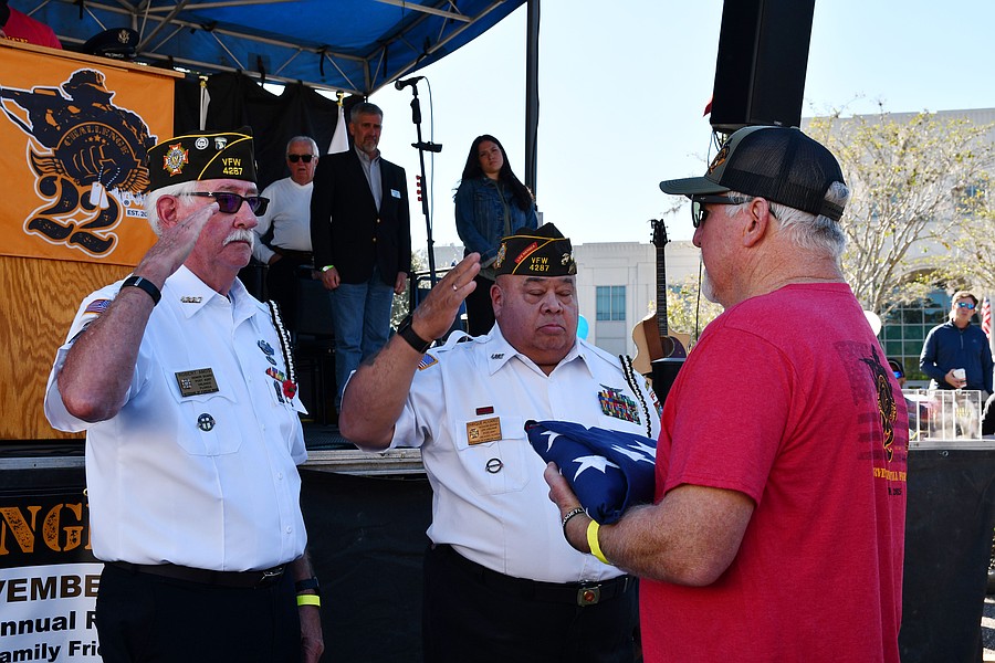 After diligently folding an American flag, Honor Guard members Robert Amos and Enrique Alvarez presented it to Challenge 22 founder Kurt Gies.