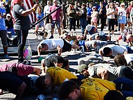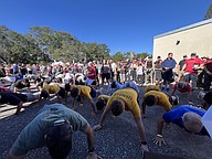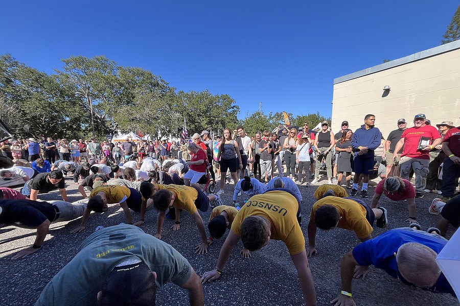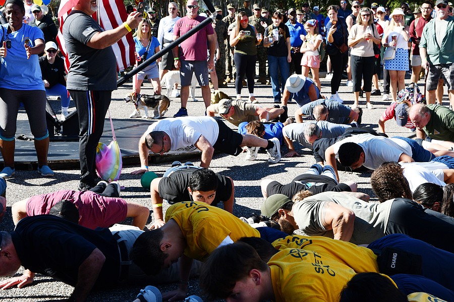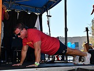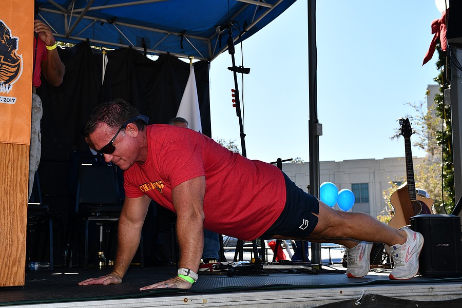 Mike Winslow demonstrated how to do a pushup before dozens of people did 22 pushups as a warm up to the walk.