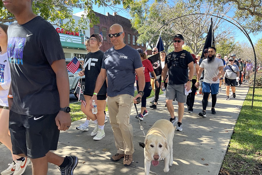 Windermere Town Council member Tony Davit, who is a veteran, walked with his dog for the first time in the Challenge 22 Ruck Walk.
