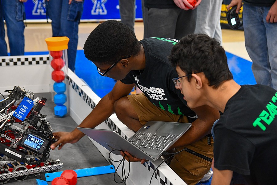 Windermere robotics club president Nathaniel Jocelyn worked on troubleshooting the robot from his laptop.