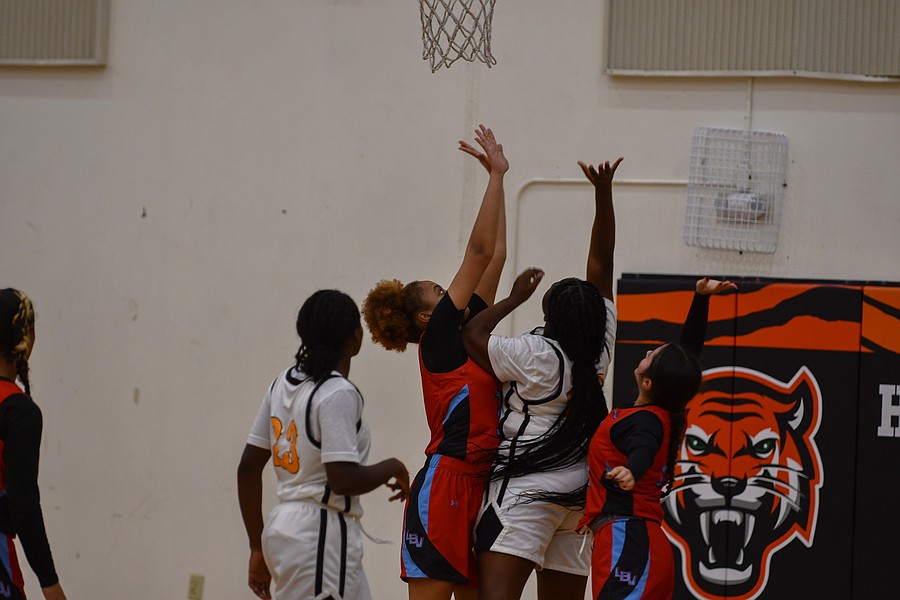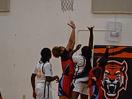 The Vipers and the Fightin’ Tigers battled under the rim for the rebound.