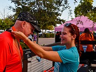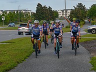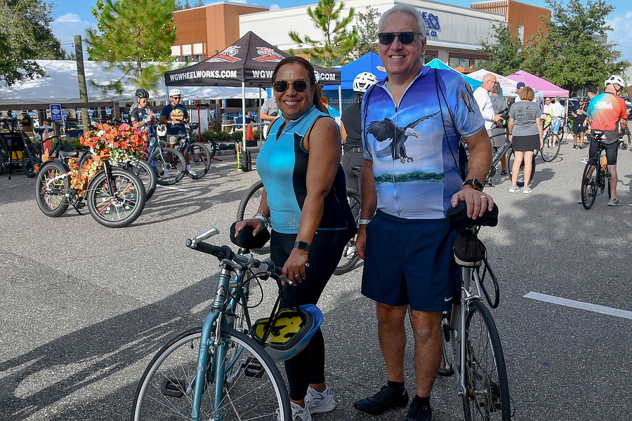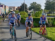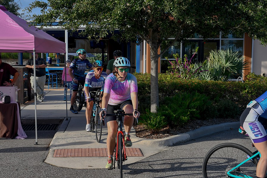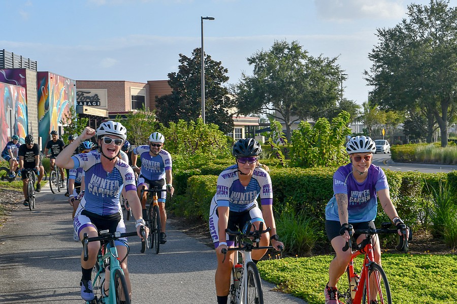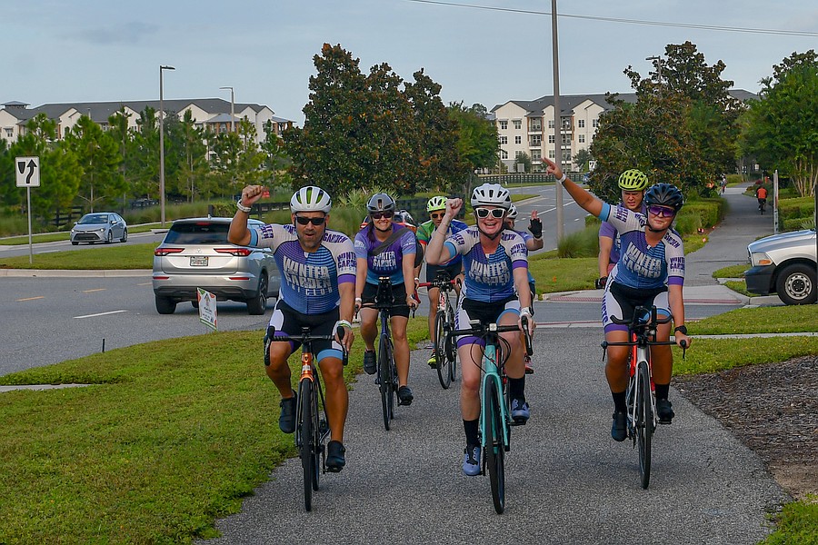 The Winter Garden Tri Club started and finished the ride together. They all cheered as they crossed the finish line in matching outfits.