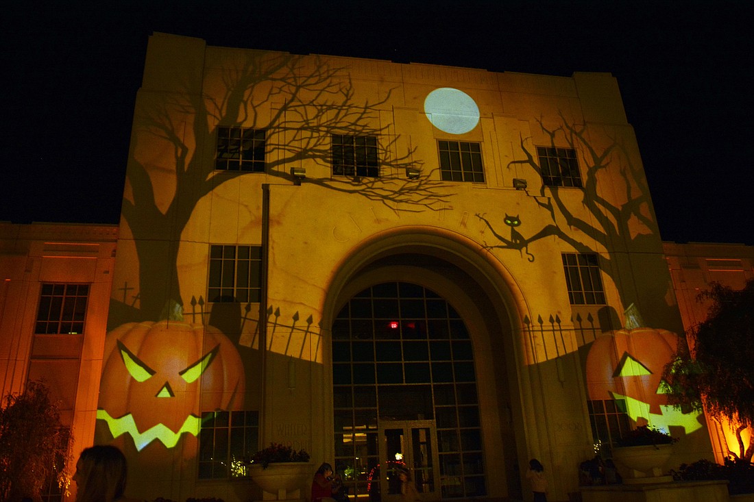 Ghosts, goblins, witches and other spooks will be projected onto City Hall synchronized to Halloween music plays.
