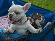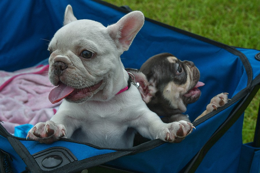 Nine-week-old French Bulldogs enjoyed their time in the stroller when their sibling had its photo taken.