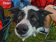 The dog had to practice its patience as they waited for the peanut butter eating contest to begin.