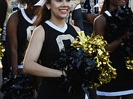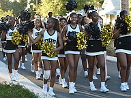 Cheerleaders ruffled their pom poms and waved as they went down the street.
