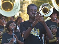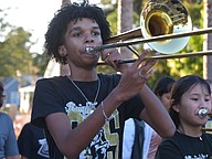 Kevon Tulloch marched steadily in the parade as he played the trombone.