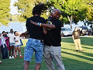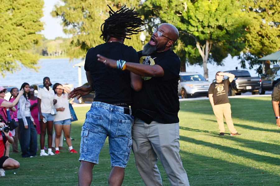 Bernard Hendricks, right, the Ocoee High band director, playfully chest bumped a student after hyping everyone up for homecoming.