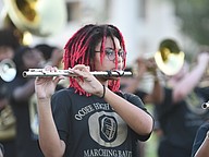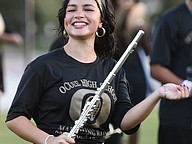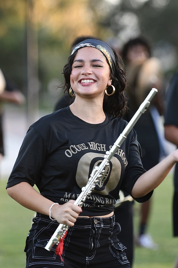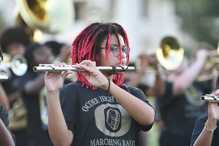 Myuri Bellamy stood tall while playing flute during Ocoee High's band performance after the parade.