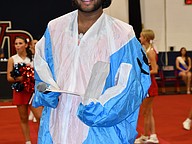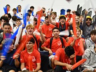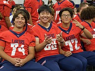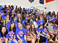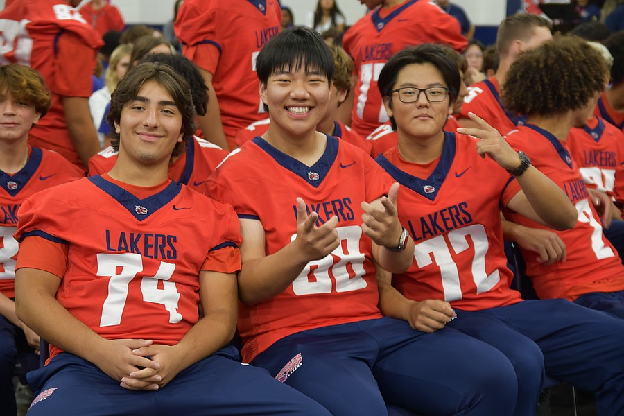 Football players showed off their smiles while sitting up front during the pep rally inside the gym.