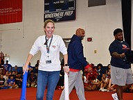 Faculty Laura Beck, along with other faculty members, had just as much fun as the students during the pep rally.