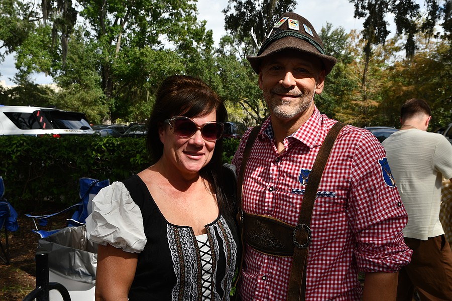 Hallie and Chris Maddock were dressed in dirndl and lederhosen to celebrate Oktoberfest.